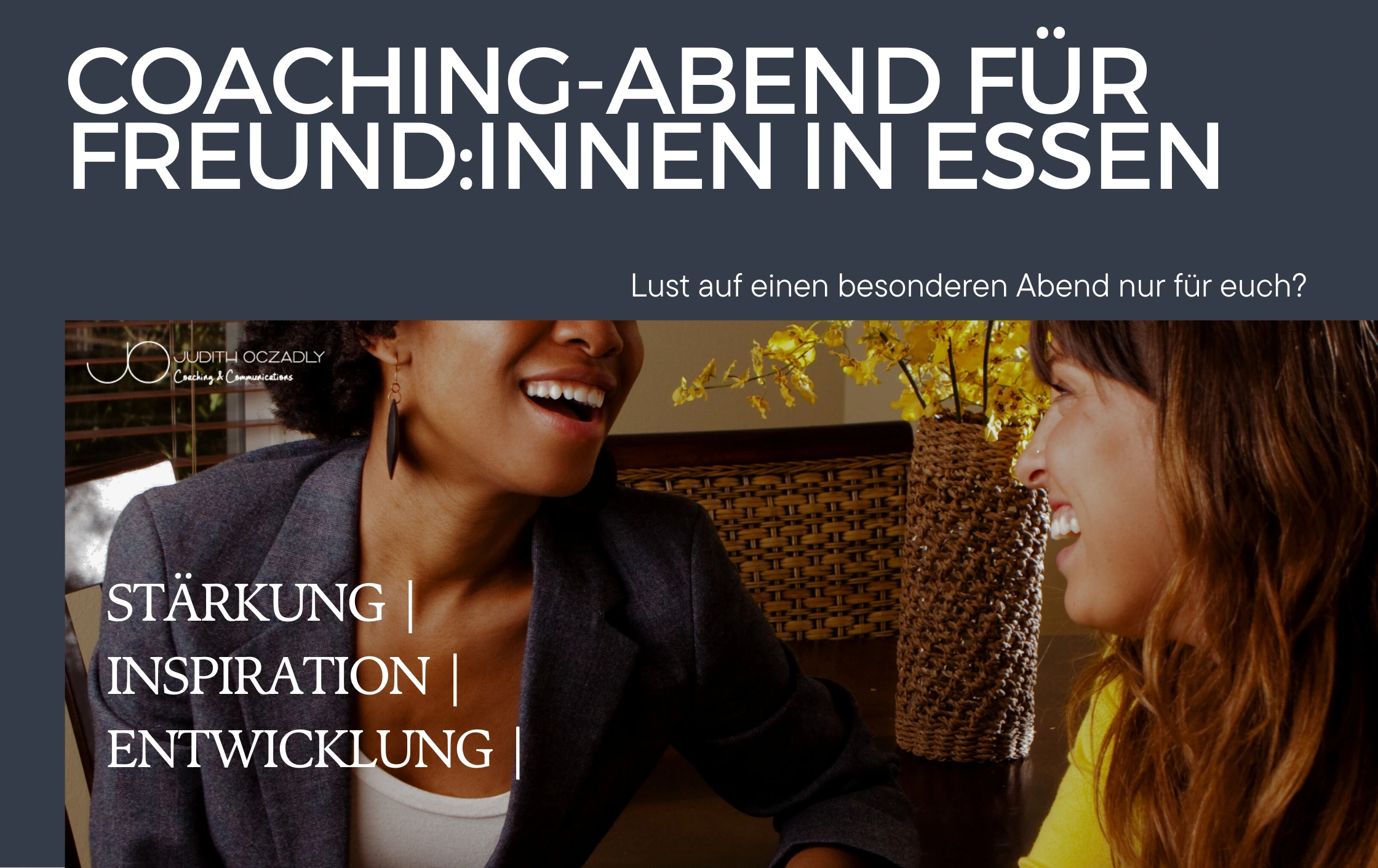 Im Alltag reden wir viel – aber selten wirklich tief.Dieser Coaching-Abend ist eine bewusste Pause vom Funktionieren. Ein Raum, in dem ihr als Freund:innen innehalten, ehrlich hinschauen und euch gegenseitig stärken könnt.In meinem Coaching-Abend für Freund:innen in Essen erlebt ihr eine inspirierende, verbindende Zeit voller neuer Perspektiven, ehrlichem Austausch und frischer Energie. Ihr sortiert Gedanken, schaut auf eure aktuelle Lebenssituation und entdeckt neue Impulse für eure nächsten Schritte – jede:r für sich und ihr als Gruppe.